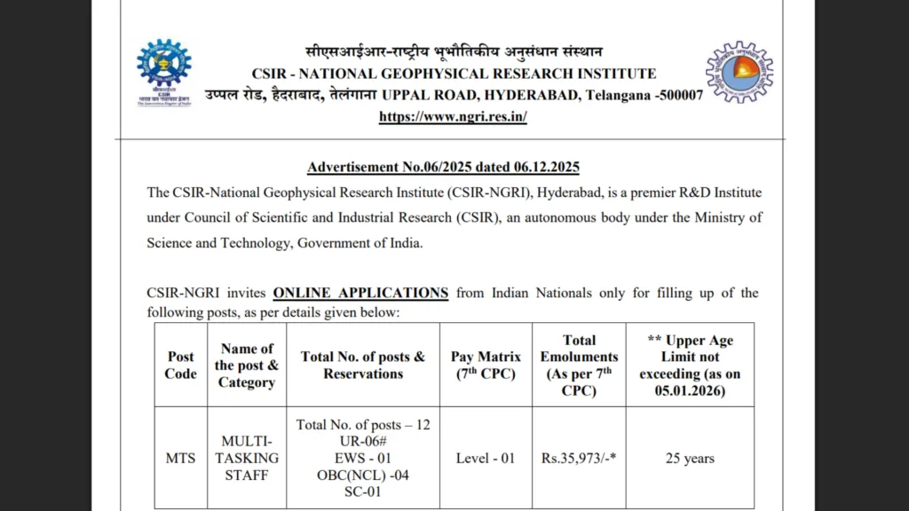 CSIR NGRI Multi Tasking Staff Recruitment 2025: The National Geophysical Research Institute (CSIR NGRI) has issued an official notification for the recruitment of 12 Multi Tasking Staff (MTS) posts. Eligible and interested candidates can submit their applications online through the official CSIR NGRI website. The last date to apply is 05 January 2026.