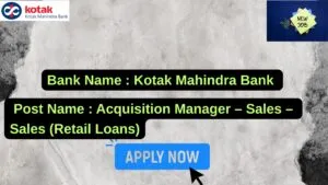 Kotak Mahindra Bank New Job : Apply for the post of Acquisition Manager – Sales – Sales (Retail Loans)