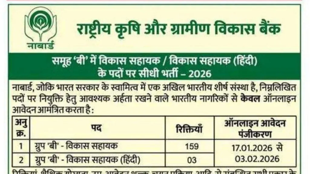 NABARD Development Assistant Recruitment 2026: The National Bank for Agriculture and Rural Development (NABARD) has issued an official notification for direct recruitment to Group ‘B’ posts of Development Assistant and Development Assistant (Hindi) for the year 2026. NABARD is a leading all-India apex financial institution under the Government of India, dedicated to promoting agriculture and rural development across the country.