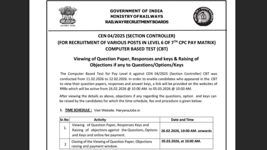 RRB Section Controller Answer Key 2026: The Railway Recruitment Board (RRB) has released the Answer Key 2026 for the Section Controller recruitment examination conducted for 368 posts. Candidates who appeared in the exam can now check their response sheet and verify their answers through the official website. Aspirants are also allowed to raise objections within the stipulated time period by paying the prescribed fee. Applicants are advised to download the answer key and review their responses carefully before the objection deadline.