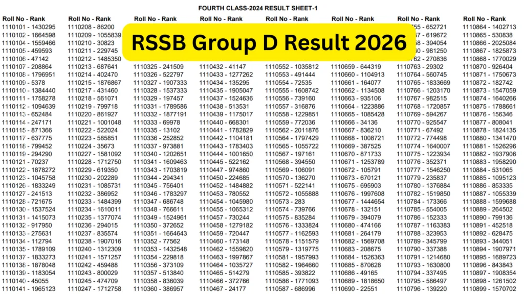 RSSB Group D Result 2026: The Rajasthan Staff Selection Board (RSSB) has officially released the Group D Exam Result 2026 for a total of 53,749 posts. Candidates who appeared in the examination can now check their result by downloading the official PDF. The result contains roll numbers of shortlisted candidates for the next stage of the recruitment process. Applicants are advised to verify their details carefully and keep a copy of the result PDF for future reference.